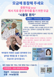 다음달 비자 만료로 보험금 수령도 어려워뇌출혈로 쓰러져 뇌사 상태에 빠진 우리 대학 태국인 언어교육원(언교원)생 시리냐씨를 위한 모금이 진행되고 있다. 그는 한국어를 공부하고 싶다는 생각에 지난해 9월 우리 대학을 찾았지만 예상치 못한 뇌출혈을 맞이했다. 그러나 경제적 형편이 어려워 병원비 마련에 어려움을 겪고 있다.지난 7월 21일, 언교원은 시리냐씨가 며칠 연속으로 수업에 결석하고 연락마저 닿지 않자 같은 국적 유학생에게 시리냐씨가 머무는 고시텔에 방문해 달라고 요청했다. 시리냐씨는 의식이 없는 상태로 방에 쓰러져 있던 채 발견