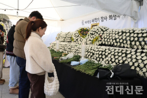 하루 5천명 이상 추모10·20대 가장 많아추모 현장 묵묵히 지킨 봉사자들지난해 12월 29일 무안공항, 181명의 추억을 담고 귀국할 예정이었던 비행기가 추락했다. 생존자 2명을 제외한 전원이 사망한 끔찍한 참사였다. 85명이라는 가장 많은 희생자가 발생한 광주에는 5·18민주광장(광장)에 합동분향소(분향소)가 차려졌다. 한 해의 끝부터 시작된 추모는 또 다른 한 해의 시작까지도 이어졌다. 분향소는 12월 29일부터 지난 4일까지 일주일 동안 광장에서 진행됐다. 기자가 12월 31일과 지난 1일 분향소에 다녀왔다. “어린아이 참변