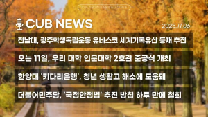 오늘의 헤드라인입니다.우리 대학이 오는 7일까지 '2025 한 책 독서 후기 공모전'을 진행합니다.최근 대학가에서 AI를 이용한 부정행위가 이어져 각 대학에서 대책 마련에 나서고 있습니다.광주광역시가 도시철도 2호선 공사로 인해 남구 회재로 도로를 부분 통제합니다.국립아시아문화전당이 대표 콘텐츠 부재로 인해 '도시의 섬'이라는 오명을 낳았습니다.자세한 소식, 잠시 후에 전해드립니다.제작: 박상빈기술: 양여은아나운서: 전현빈