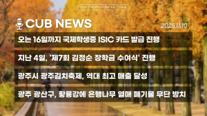 오늘의 헤드라인입니다.02:04 오는 16일까지, 국제학생증 ISIC(아이에스아이씨) 카드 발급이 진행됩니다.02:52 지난 4일, 대학본부에서 ‘제 7회 김정순 장학금 수여식’을 진행했습니다.03:40 광주시가 개최한 광주김치축제가 역대 최고 매출을 달성해 ‘민생회복 축제’로 입지를 굳혔습니다.04:20 광주 광산구가 은행나무 열매 폐기물을 장록 습지인 황룡강에 무단 방치해 하천법 위반으로 인한 피해가 발생했습니다.자세한 소식, 잠시 후에 전해드립니다. 제작 : 김가희기술 : 김태희아나운서 : 강승현