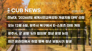 오늘의 헤드라인입니다.우리 대학이 '2026년도 세계시민교육강좌 개설지원 대학'으로 선정됐습니다.오는 12월 6일 광주광역시 북구에서 제3회 광주 북구청장배 전국 아마추어 E-스포츠대회를 개최합니다.광주광역시 군 공항 이전 '6자 협의체'가 정상 운영 될 지 주목받고 있습니다.최근 온라인에서 취업을 명목으로 청년에게 보험사기를 진행하는 사례가 끊임없이 발생하고 있습니다.자세한 소식, 잠시 후에 전해드립니다. 제작: 박상빈기술: 양여은아나운서: 전현빈