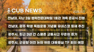 오늘의 헤드라인입니다. 지난 3일, 우리 대학 법학전문대학원 1호관의 개축 준공식이 진행됐습니다.우리 대학이 광주 학생 독립운동 기록물의 유네스코 세계 기록 유산 등재를 추진 중에 있습니다.광주 지역 스쿨존 교통사고가 최근 3년간 꾸준히 늘고 있는 것으로 드러났습니다.광주 군공항 이전 논의를 위한 대통령실 테스크포스가 연내 첫 회의를 열 예정입니다. 자세한 소식, 잠시 후에 전해드립니다. 제작: 김지유기술: 정여진아나운서: 박지현