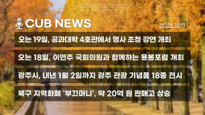 오늘의 헤드라인입니다.오는 19일, 우리 대학 공과대학 4호관에서 명사 초청 강연이 개최됩니다.오는 18일, 우리 대학에서 이연주 국회의원과 함께하는 용봉포럼이 개최됩니다.광주광역시가 내년 1월 2일까지 광주 대표 관광 기념품 18종을 전시합니다.광주 북구 지역화폐 ‘부끄머니’가 발행 첫 날 약 20억 원의 판매고를 올렸습니다.자세한 소식, 잠시 후에 전해드립니다. 제작: 한다현기술: 강승현아나운서: 이지원