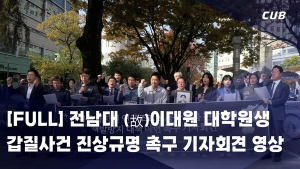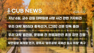 오늘의 헤드라인입니다. 지난 6일, 우리 대학 교수 갑질에 의한 대학원생 사망사건에 대해 유족들과 시민사회단체의 진상규명 촉구 기자회견이 열렸습니다. 오는 25일에 진행되는 우리 대학 제55대 총학생회 선거에 [그린] 선본이 단선으로 출마합니다. 우리 대학 법학전문대학원에서 문형배 전 헌법재판관 초청 강연이 진행됩니다. 무안공항 재개항이 또 연기되며, 광주시가 정부에 '광주공항 국제선 임시 취항'을 촉구했습니다. 자세한 소식, 잠시 후에 전해드립니다. 제작: 박상빈기술: 한다현아나운서: 문채호