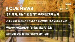 오늘의 헤드라인입니다.오는 11월 말까지, 우리 대학에서 재학생들의 폭력예방교육을 실시합니다.오늘 오후 2시부터, 광주시의회에서 광주학생운동 유네스코 세계기록유산 등재 방안 모색 회의가 진행됩니다.국립아시아문화전당에서 정서회복 프로그램인 '마음힐링교육'을 운영합니다.무안국제공항의 폐쇄로 호남권 항공 접근성이 장기간 단절돼 지역경제가 위축되고 지역민의 불편이 계속되고 있습니다. 자세한 소식, 잠시 후에 전해드립니다. 제작 : 김가희기술 : 김태희아나운서 : 강승현