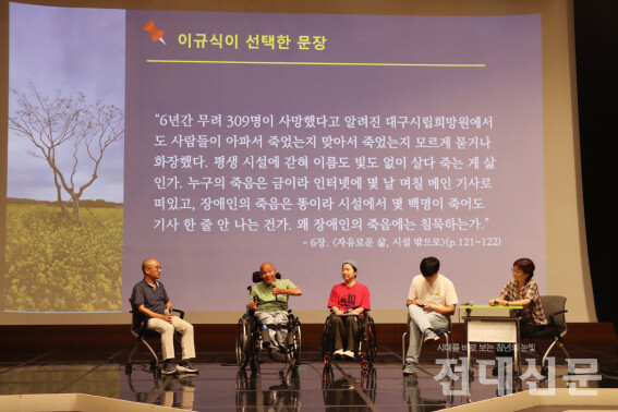 이야기 손님으로 북 콘서트에 참가한 김미숙 광주장애인가정상담소 사무국장은 “장애인들이 왜 이렇게까지 싸우는지 알 수 있는 책”이라며 “특히나 저와 같은 젊은 운동가들에게 꼭 추천해 주고 싶다”고 말했다.
