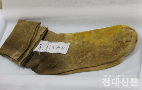 류동운 열사는 5·18 당시 전남도청을 사수하다가 5월 27일 계엄군 총에 사망했다. 그가 5·18 현장에서 신고 있던 노란 양말이다. 이 또한 망월동 묘역에서 국립5·18민주묘지로 이장하며 나온 기록물들이다.