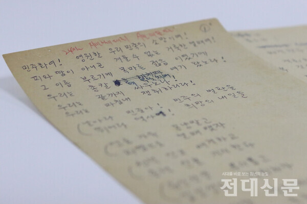 1980년 5월 24일, 2차 궐기대회에서 광대 단원 최인선에 의해 낭독된 1980년도 광주의 비극을 밝히는 시의 원본이다. 이는 당시 도청 앞 분수대 연단에서 낭독과 제창된 시다.