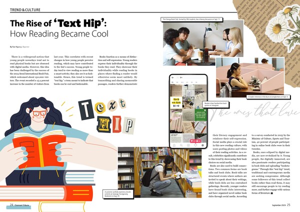 There is a widespread notion that young people nowadays tend not to read physical books. but are obsessed with digital media. However, this idea has been challenged by the success of the 2024 Seoul International Book Fair, which welcomed about 150,000 visitors. The event recorded a 15.4 percent increase in the number of visitors from last year. This correlates with recent changes in how young people perceive reading, changes which may have contributed to the fair’s success. Young people today tend to view reading as more than a smart activity; they also see it as fashionable. Hence, this trend is termed “text hip” a term meant to indicate that books can be cool and fashionable.