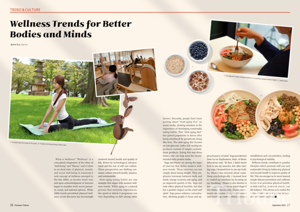 Yoga and Pilates are among the types of exercise that define modern wellness trends. These exercises are not simply about losing weight. They emphasize harmony between body and mind, energy recovery, anti-aging, and an improved quality of life. Yoga not only offers physical benefits, but also has a positive impact on the mind and spirit. Yoga poses enhance concentration, allowing people to focus and approach peace of mind. Yoga practitioner Eom Ga-on (Sophomore, Dept. of Music Education) said, “At first, I didn’t know how to use my muscles, but after starting yoga, I learned how to use my body. So, when I was worried about something psychologically, I learned how to control my emotions by focusing on my breathing.” Pilates is also known to have a positive effect on psychological well-being. Specifically, Pilates movements emphasize synaptic awareness and breathing control, which enhance mindfulness and concentration, leading to psychological stability.